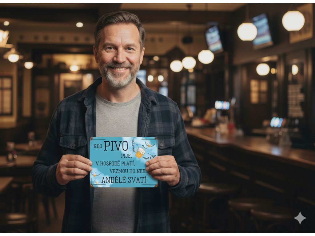 Plechová cedule Kdo pivo pije, v hospodě platí...